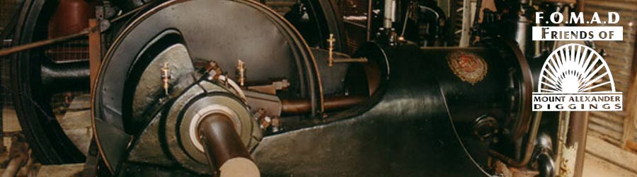 Rejuvenated "Ruby", the Ruston & Hornsby gas suction engine used by the late Alf Cocks to pump water for his sluicing operations at the Forest Creek Historic Gold Diggings site in Wesley Hill. ìSheî is now powered by an electric motor driving the massive 5 ton flywheel and two huge pistons. (small pic of the engine Ruby.jpg)